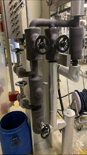 - În imagine este prezentat modul în care materialul izolator, CTP, a fost aplicat pe robinetul ce controlează debitul de abur, precum și pe ramificația în forma de "T" alăturată.
